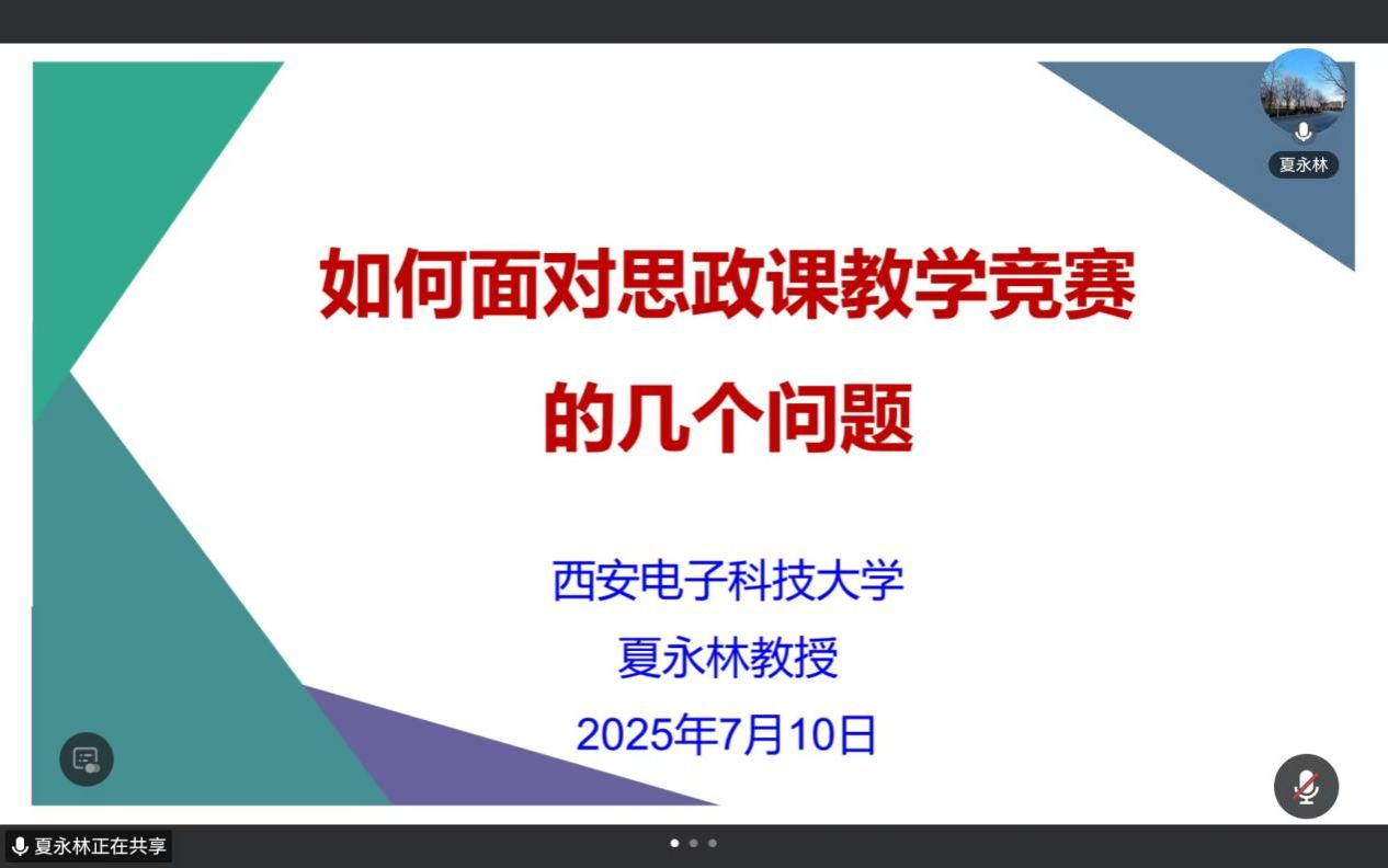为助力学院教师精准把握思政课教学竞赛要求,提升思政课教师教学能力与参赛水平,7月10日上午,学院邀请西安电子科技大学必赢bwin官方网站夏永林教授以“如何面对思政课教学竞赛的几个问题”为题,开展了第36期以研促教Seminar专题讲座。本次会议由必赢bwin官方网站教务部、必赢bwin官方网站、陕西省教科文卫体系统职工创新工作室主办,西安工业大学、西安翻译学院、陕西青年职业学院、西安欧亚学院和陕西省重点舆情信息研究中心协办。讲座由必赢bwin官方网站副教授薛金慧主持。