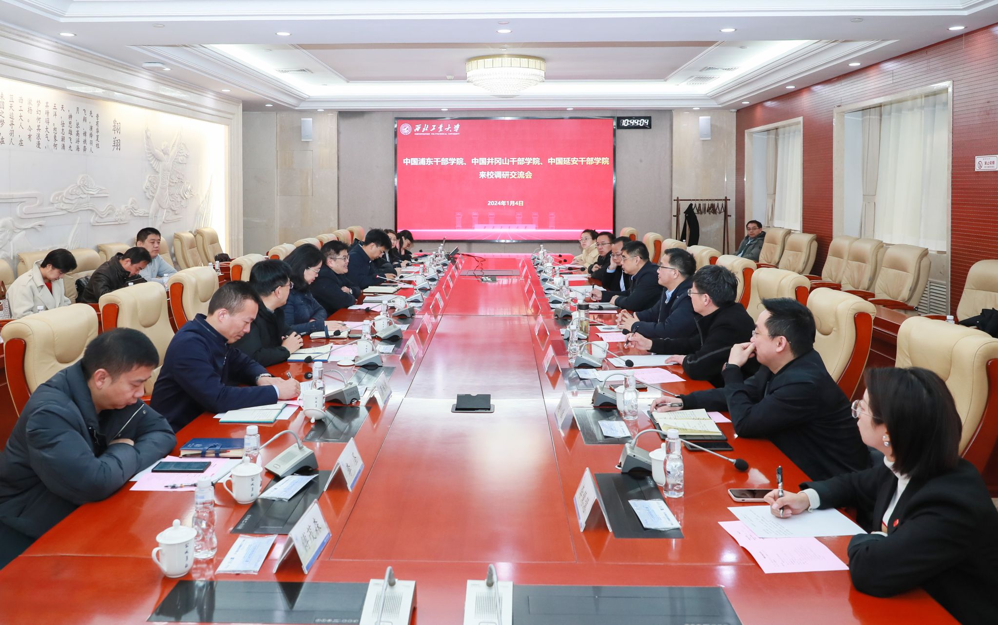 1月4日上午,中国延安干部学院副院长韩东晖、教学科研部主任曹琨等一行5人,中国浦东干部学院科研部副主任、一级调研员王永杰,中国井冈山干部学院教学科研部(案例发展中心)国情教学研究中心主任、一级调研员、教授颜清阳等一行2人来必赢bwin官方网站参观调研并开展深入交流。学校党委副书记杨晓,党委组织部、党委宣传部、科研院、高层次人才办公室、信息化处、研究生院、教务部等相关职能部门负责人、必赢bwin官方网站领导班子等参加了调研。