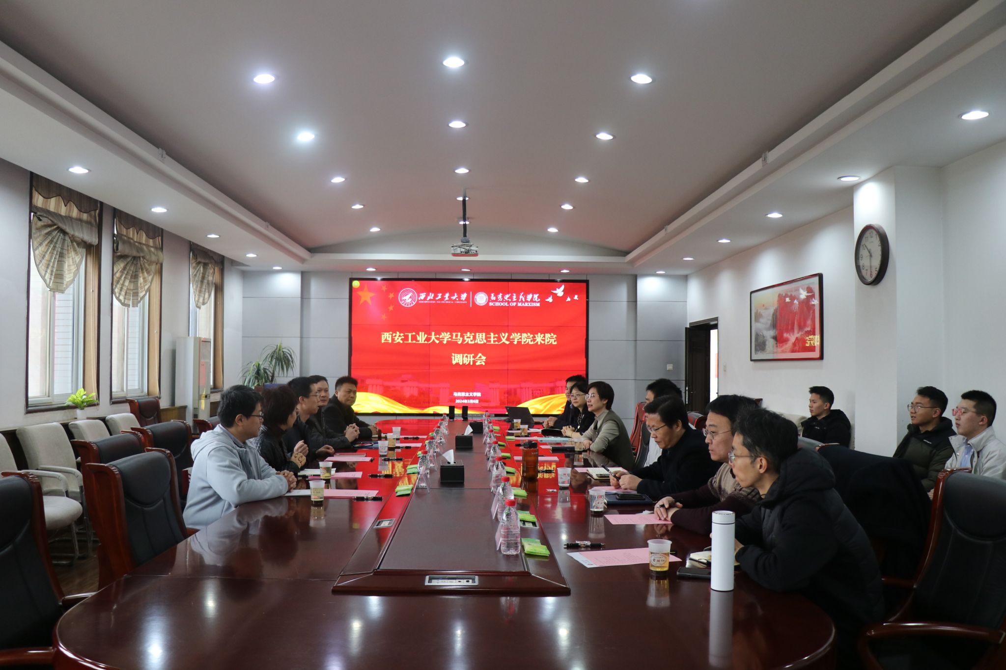3月6日上午,西安工业大学必赢bwin官方网站院长梁华平一行来必赢官网必赢bwin官方网站调研。学院党委书记蒲传新、副书记李刚,副院长贺苗、德法与形势政策系主任胡建发、马克思主义中国化研究系教学主任华艳君、中国近现代史基本问题研究系教学主任房小捷、马克思主义基本原理系教学主任杨永强、思想政治教育系副教授代家玮及硕士生代表等参加了此次调研会。会议由副院长贺苗主持。